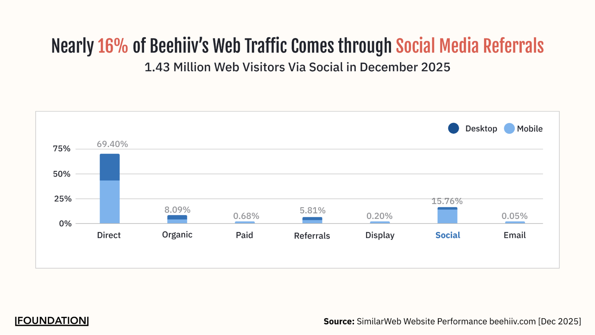 Nearly 16% of Beehiiv's Web Traffic Comes through Social Media Referrals: 1.43 Million Web Visitors Via Social in December 2025