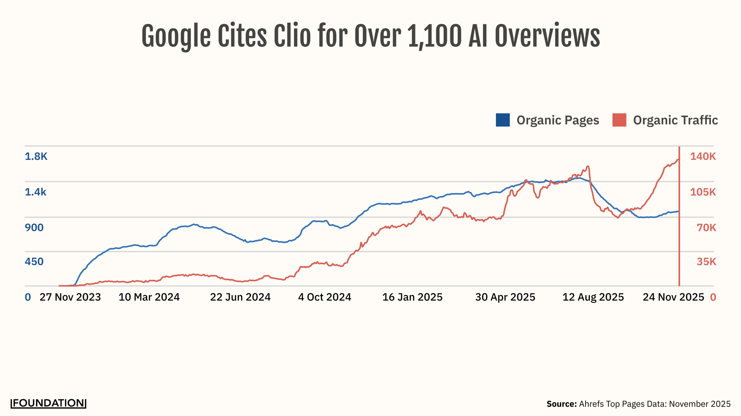 Clio is a vertical SaaS platform for law firms, but it’s also something else: a live case study in how a decade of smart organic marketing can turn into outsized visibility in AI Overviews, ChatGPT, Perplexity, and beyond.