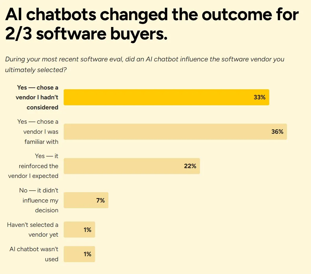 During their most recent software evaluation, 69% of buyers said an AI chatbot influenced which vendor they ultimately selected — including 33% who chose a vendor they’d never previously considered.