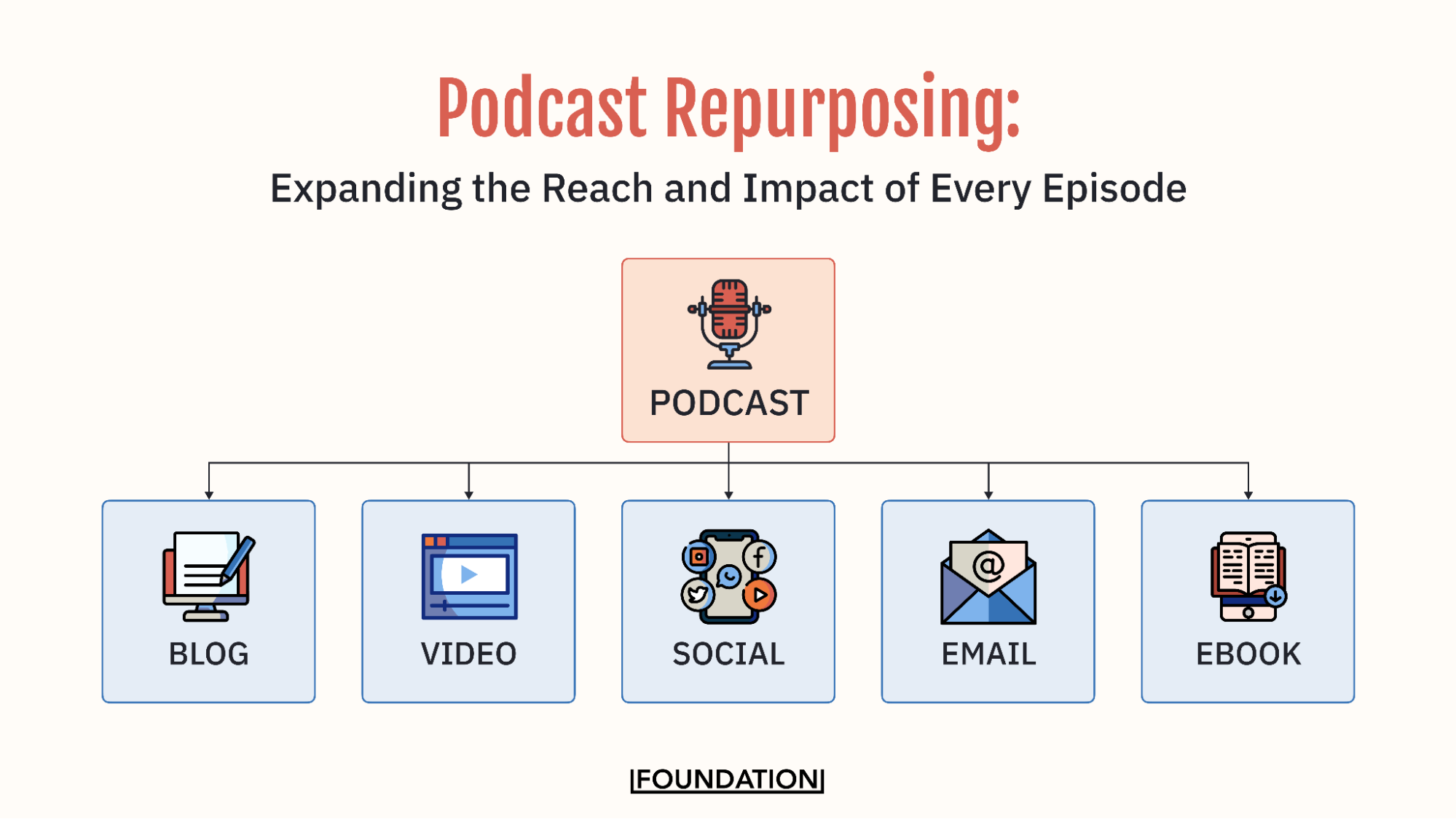 Through podcast repurposing, one 40-minute episode can become 10+ assets for 5+ different channels