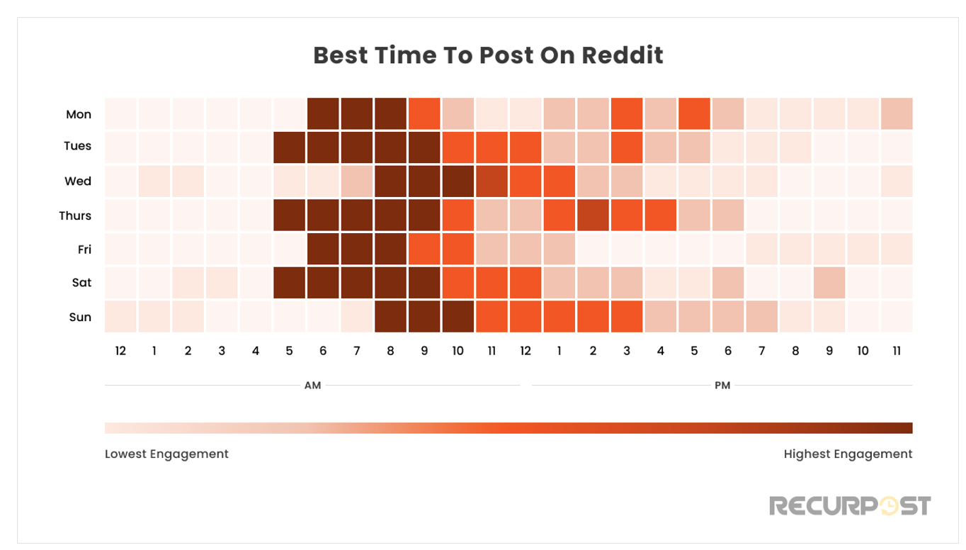 This heatmap from RecurPost illustrates the best times to post on Reddit based on user engagement throughout the week. The darkest shades represent peak engagement, showing that the early morning hours—particularly between 6 AM and 10 AM EST from Monday to Saturday—tend to generate the highest interaction.