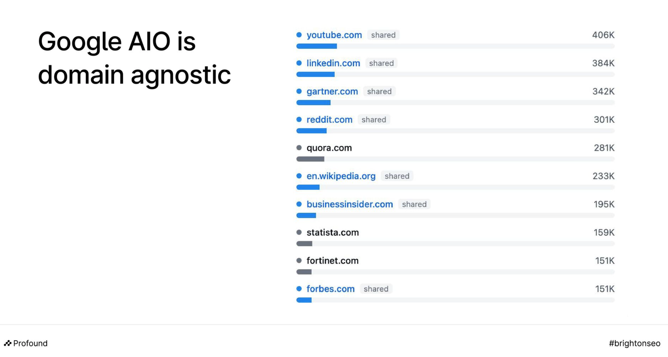 At an event called BrightonSEO, the Profound team also shared this list of sources that are relied upon by Google AIO. According to their dataset, the vast majority of the queries relied on YouTube but the split across most channels was pretty similar at large with Reddit in the top five sources for LLM responses: