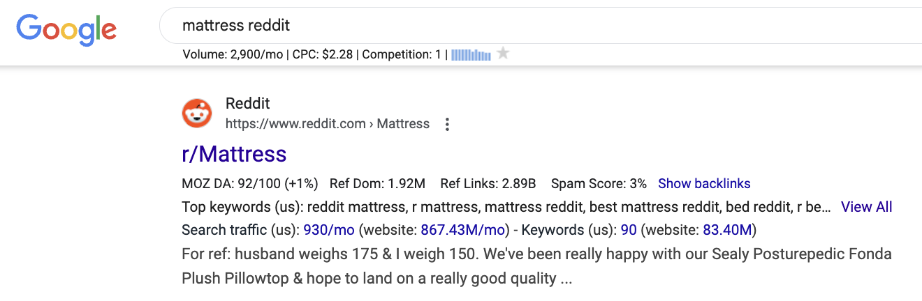 Over the last few years, people have become so frustrated with the number of listicles that don’t add value to their lives. As such, people have started to modify their own search queries to include the word “Reddit” to help them land on threads that are coming directly from people. As an example, the SERP below shows that 2,900 searches happen every single month for the query “mattress reddit” and mattress companies are willing to spend $2.28 per click to get these visitors: