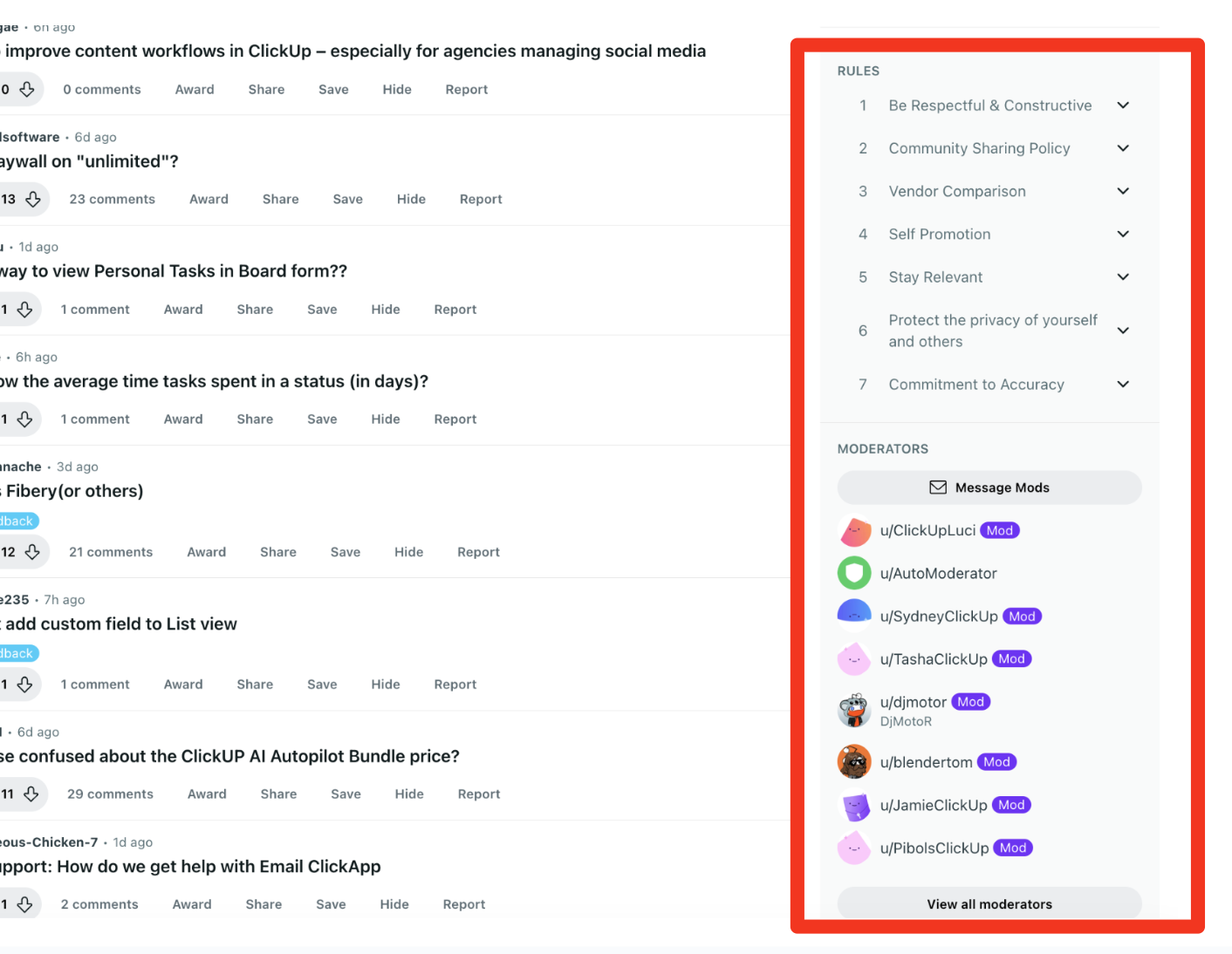 Most successful branded subreddits define clear posting rules (e.g., no spam, how to submit feature requests, tagging bugs properly). The rules that ClickUp uses (see the screenshot above) are aligned with best practices.