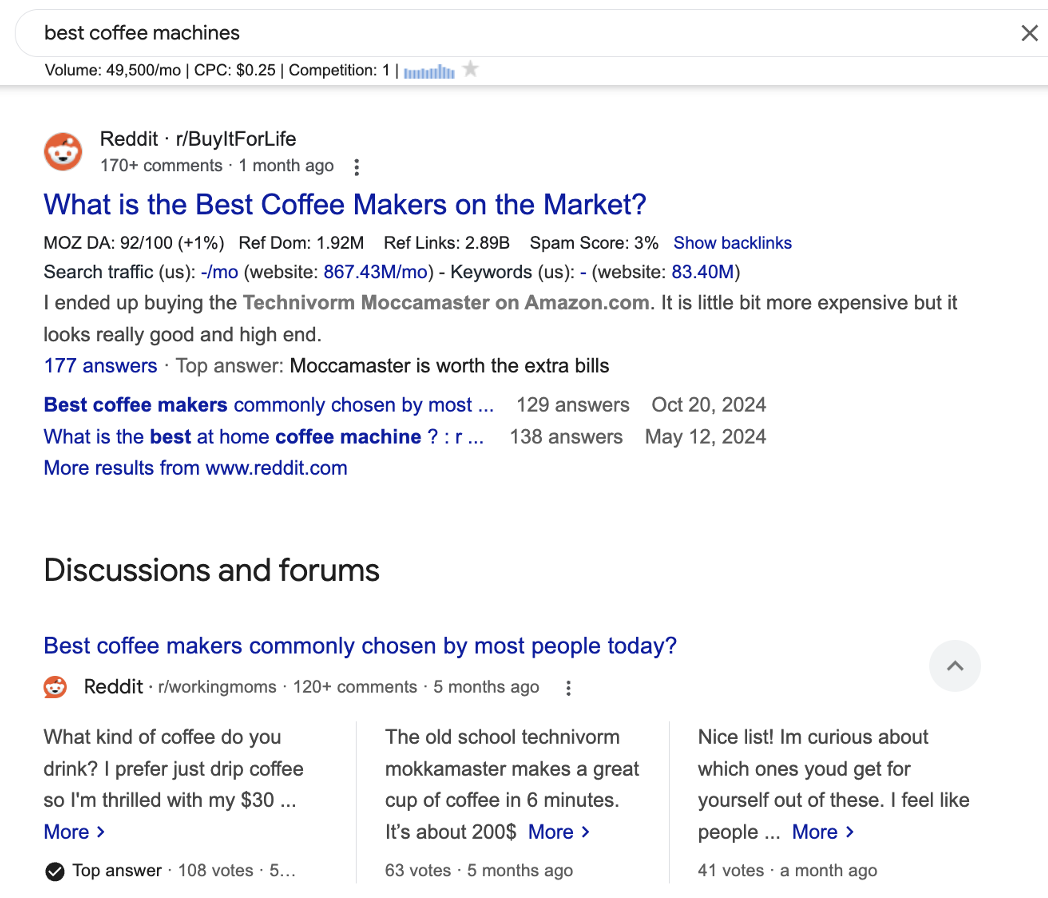 For example, if you take the time to type in “best coffee machines” in Google you will be met with a SERP that is filled with Reddit. Today, it’s estimated that over 49,000 people look for the best coffee machines on Google every single day. The top ranking URL in the SERP at the time of this publication is a Reddit thread followed by two others:
