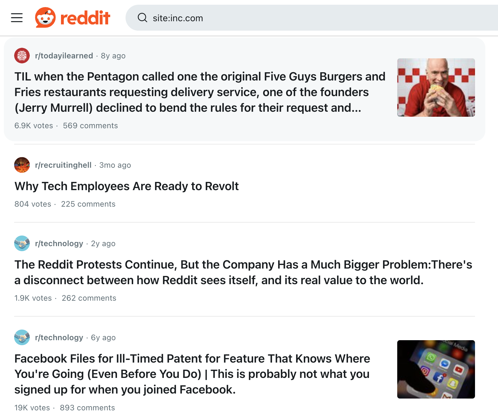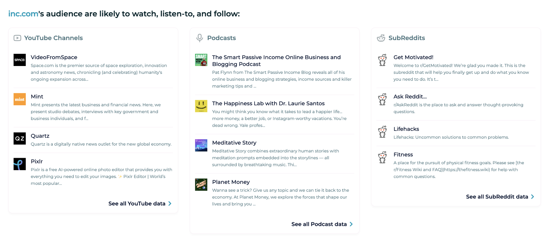 This is all about finding the channels your audience browse regularly and then using that to uncover content-market fit. Here’s a snapshot from SparkToro’s Reddit experience for Inc.com Readers: