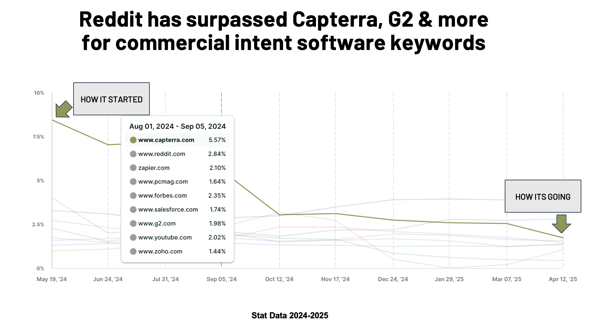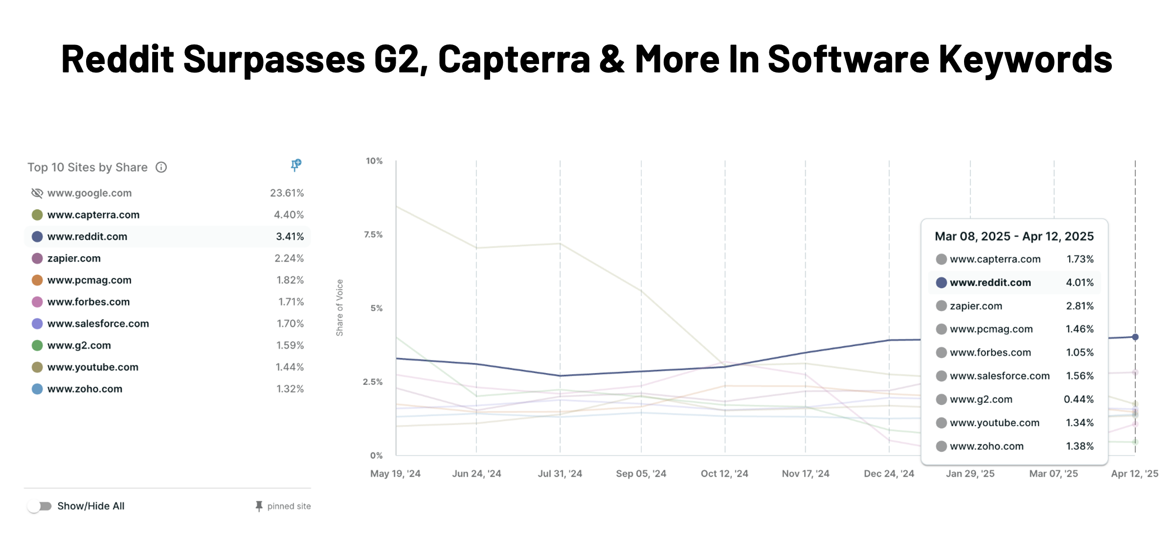 In May 2024, Capterra was one of the leading websites for commercial and transactional intent keywords in software. Today, the number one most trafficked site from organic search is Reddit and it’s showing no signs of slowing down.