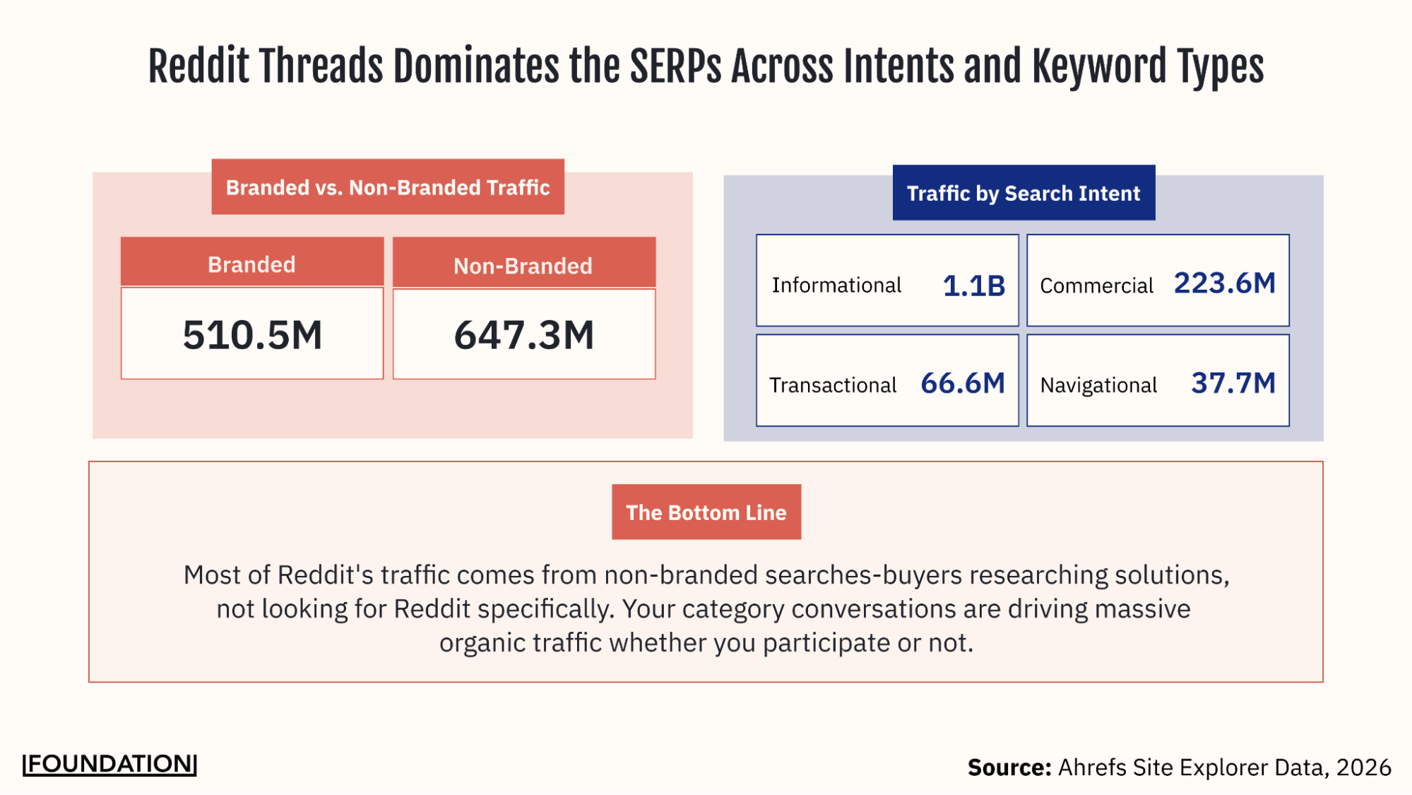 Ahrefs data shows that informational searches alone drive 1.1 billion monthly visits to Reddit, and non-branded, solution-oriented searches generate another 654 million.